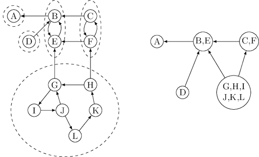 This tells us something important: The connectivity structure of a directed graph is two-tiered. At the top level we have a dag, which is a rather simple structure—for instance, it can be linearized. If we want finer detail, we can look inside one of the nodes of this dag and examine the full-fledged strongly connected component within.